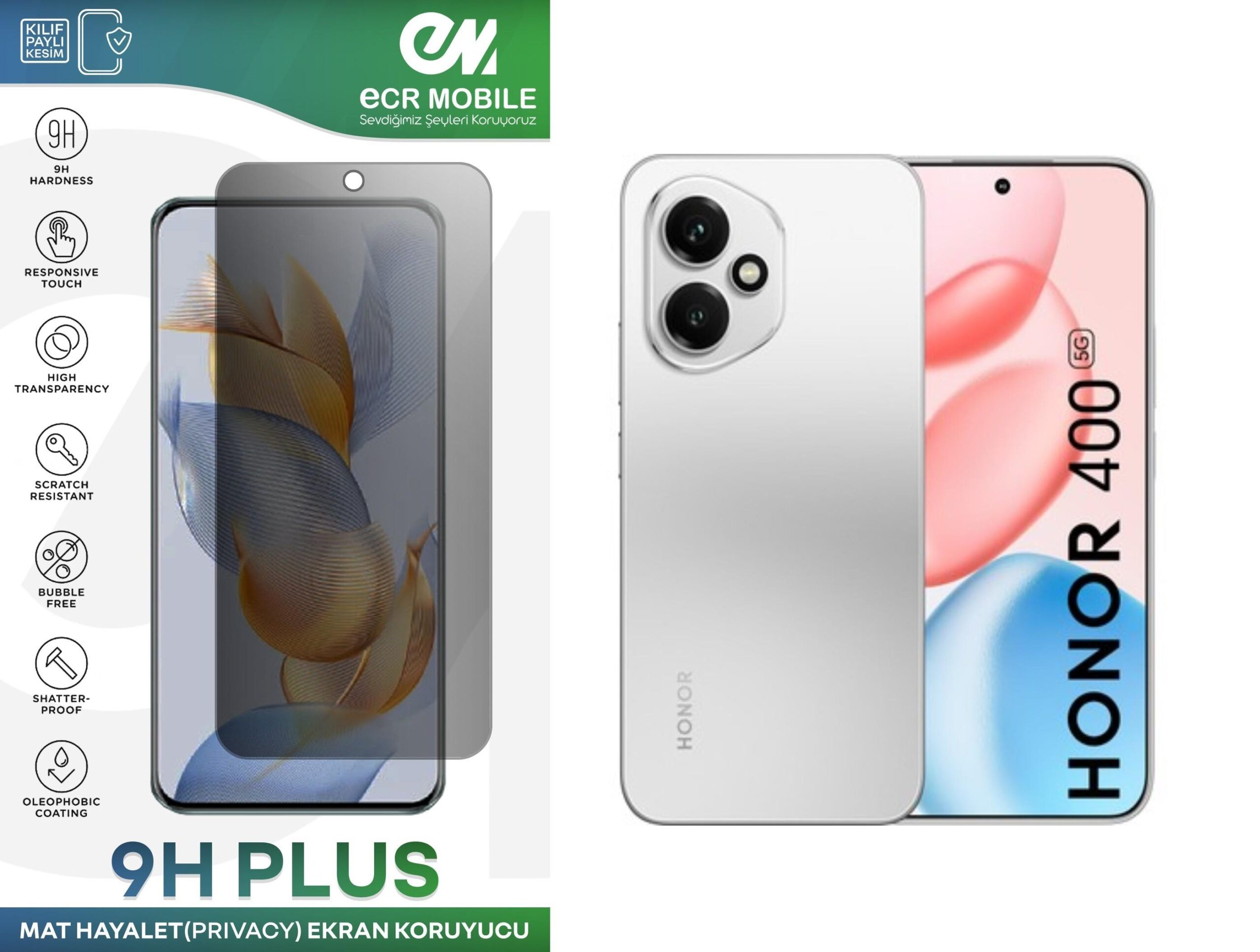 Ürün tempered cam değildir.9H esnek nanodur. Kırılmaz ve çatlamaz.Honor 400 modeli ile tam uyumludur.Ön kamera yeri açıktır. Ürün hayalet ve mat özelliklidir. Parmak izi bırakmaz. Ekrandan parmak izi okuyan modellerde hayalet ekran koruyucular takıldığında parmak izi çalışmyabilir. Lütfen bu bilgiler ışığında sipariş geçiniz.Gizliliğinizin ve hassas verilerinizin korunması, günümüzde mobil cihaz kullanıcıları için en önemli konulardan biridir. Telefon Hayalet (Gizlilik) Ekran Koruyucu, bu ihtiyacınızı en üst düzeyde karşılamak için özel olarak tasarlanmış bir üründür. Bu koruyucu sayesinde, telefonunuzun ekranındaki görüntüler sadece sizin bakış açınızdan net görünürken, yan taraftan veya diğer açılardan bakan kişilerin göremeyeceği bir şekilde gizlenir.Bu ekran koruyucu, gelişmiş mikro yapısı sayesinde ekranın görüntülerini yalnızca doğrudan ön taraftan bakan kişilerin görmesine olanak tanır. Yan taraftan veya diğer açılardan bakıldığında ekran görüntüleri belirsizleşir ve anlaşılmaz hale gelir. Bu, özellikle toplu taşıma araçlarında, kafelerde veya halka açık alanlarda özel verilerinizi korumak için son derece önemli bir özelliktir.Ayrıca, ECR Telefon Hayalet Ekran Koruyucu aynı zamanda ekranın çiziklerden, darbelerden ve diğer günlük hasarlardan da korunmasını sağlar. Yüksek kaliteli malzemeden üretilen bu koruyucu, ekranınızın görünümünü bozmadan, berrak ve keskin bir görüntü sunar. Ayrıca, parmak izleri ve yağ lekelerine karşı dayanıklıdır, böylece ekranınız her zaman temiz ve net kalır.ECR Hayalet Ekran Koruyucu, kolayca takılıp çıkarılabilir ve ekranınıza mükemmel bir uyum sağlayacak şekilde özel olarak kesilmiştir. Kendi kendine yapışkanlı yüzeyi sayesinde uygulaması hızlı ve sorunsuzdur.Gizliliğinizi ve verilerinizi korumak isteyen kullanıcılar için ideal bir çözüm olan ECR Hayalet Ekran Koruyucu, hem günlük kullanımınızı rahatlatırken hem de gizlilik endişelerinizi en aza indirir.”
