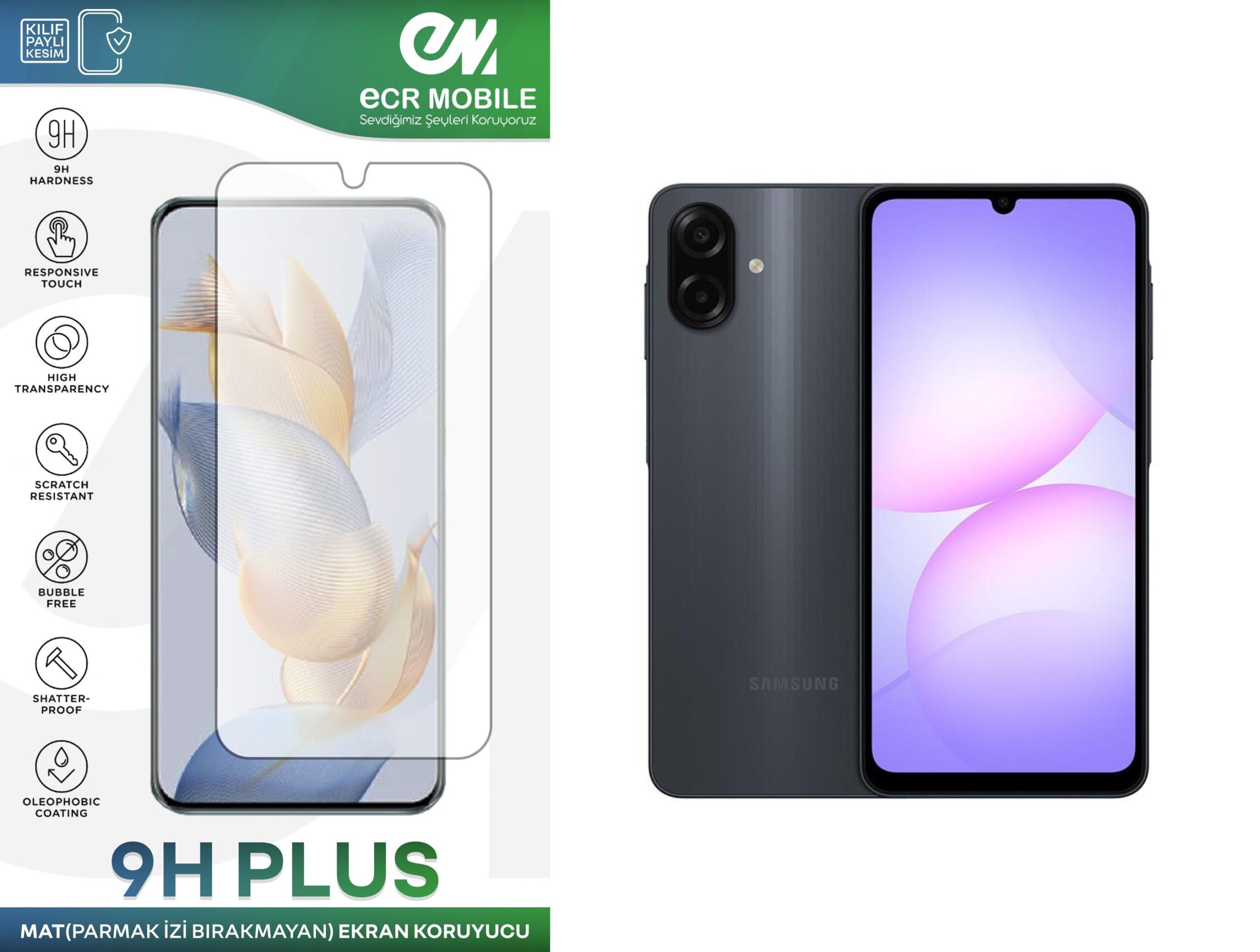Ürün tempered cam değildir.9H esnek nanodur. Kırılmaz ve çatlamaz.Samsung A07 modeli ile tam uyumludur.Ön kamera yeri açıktır.Mat(buzlu) üründür. Parmak izi bırakmaz.ECR 9H mat ekran koruyucu, cihazınızın ekranını çiziklere, darbelere ve parmak izlerine karşı korumak için üretilmiş özel bir ekran koruyucudur. ECR 9H sertliğinde cam malzemeden yapılmış olan bu koruyucu, cihazınızın ekranını yüksek düzeyde korur. 9H sertliği, ekran koruyucunun en yüksek sertlik derecesidir ve bu nedenle çizilmelere karşı son derece dayanıklıdır. Ayrıca, mat yüzeyi sayesinde, güneş ışığında bile cihazınızın ekranını rahatlıkla okuyabilirsiniz. Mat yüzey ayrıca, cihazınızın ekranında parmak izi ve yağ kalıntısı oluşmasını da engeller. ECR Ekran koruyucunun özel tasarımı, dokunmatik özellikleri etkilemeden cihazınızın ekranına tam olarak oturur. Bu sayede, cihazınızın kullanımını kesintisiz bir şekilde sürdürebilirsiniz. ECR 9H mat ekran koruyucu, cihazınızın ekranını güvenli bir şekilde koruyarak, cihazınızın ömrünü uzatmanıza ve daha uzun süre kullanabilmenize yardımcı olur.